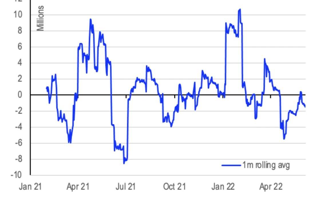 此外,一個更強勁的比特幣衍生品市場應該會讓礦商在潛在的對沖策略方面有更多的選擇。如果礦商擔心比特幣價格下跌,他們會采用的一種策略是購買上市礦業公司股票的看跌期權,這在歷史上是對比特幣價格的高beta押注。此外,為了為這些期權購買提供資金,礦商可以同時買入coveredcall期權,以實現無成本的collar策略。另一種策略是writing(selling)比特幣期貨合約,以對沖現貨敞口。就戰略對沖而言,最近的一個發展是算力衍生品的概念,但這些市場相對較新,流動性較差。然而,最簡單的對沖方法可能仍然是持續將部分比特幣兌換為法幣的策略。下圖是礦工的比特幣凈流動