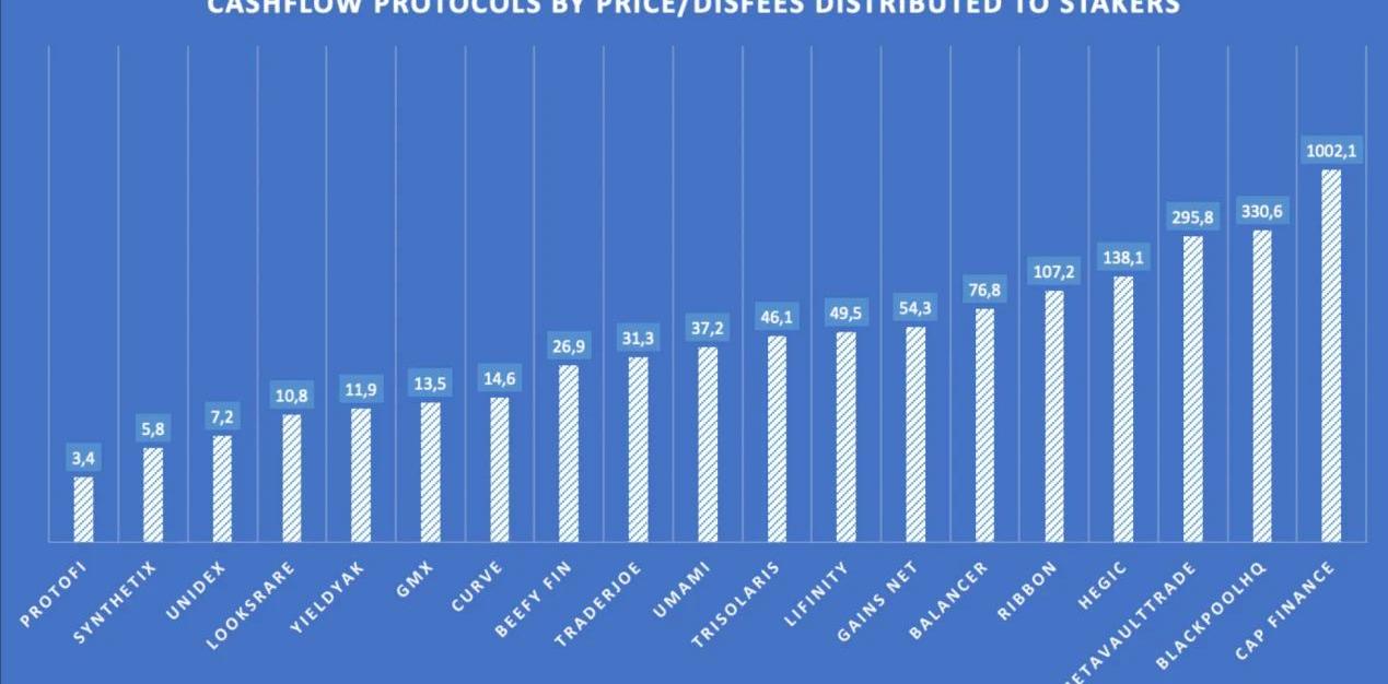 有時使用市值代替FDV,但在我看來,它不夠全面,因為它沒有考慮到未來解鎖情況,在當前情況下,通過代幣解鎖的數量和頻率即可區分一個真正的好項目和一個壞項目。但是,這個指標并不能幫助我們有效地分析現金流,事實上按照P/E指標來看,確實有很好的項目,但這些協議從未與代幣持有者或利益相關者分享一分錢,或者至少現在還沒有。考慮到這一點,我們將使用該指標的修改版本: