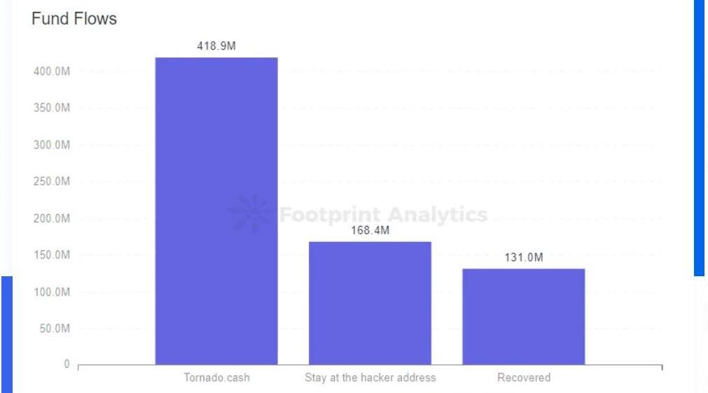 約4億1889萬美元的被盜資金流入Tornado.cash從資金流向來看,在2022年第二季度,約4億1889萬美元的被盜資金被黑客轉入了Tornado.cash,占該季度總被盜金額的58.3%。另外有1億3100萬美元的資產被追回,1億6845萬美元的資產留在黑客地址暫未進行混幣或流入交易所。數據表明,Tornado.cash依舊為黑客進行洗錢的慣用途徑。本季度資金追回的情況優于上一季度,在一些情況下,項目方會和黑客通過鏈上信息進行協商,部分黑客會選擇返還一定數量的贓款以“免于法律制裁”。