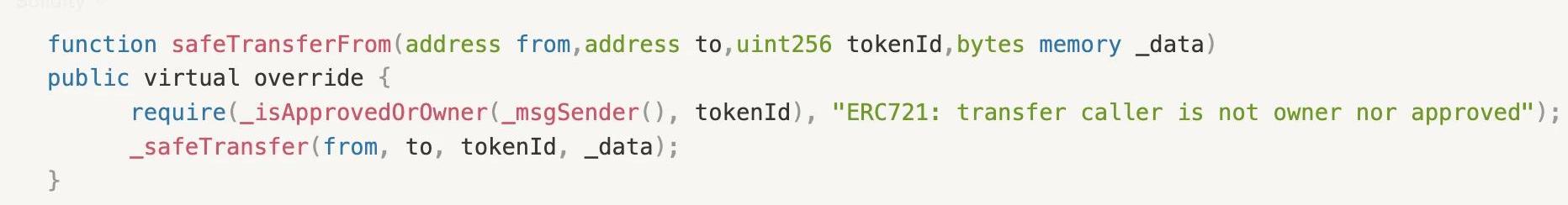 這里的交易本質調用的是_safeTransfer所以他的核心邏輯是require部分,這的一大細節是:_msgSender()這是openzepplin的標準庫Context.sol中的方法。其實就是獲取當前交易的發送者地址,但這里使用了封裝版本,而不是直接使用msg.sender是考慮到,可能存在一種交易類型“元交易”,即交易的付費gas方和交易發起方不相同的情況。所以一些處于中間環節的,類似library的合約需要考慮這種特殊情況。其余部分判斷是確定是否有授權記錄,易于理解,不作贅述