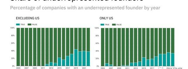 一些人認為,在支持代表性不足的創始人方面,YC在這方面做得不夠好。CircleCI和Dark的創始人PaulBiggar指出,這是一個特別令人失望的問題。他說:「他們在尋找馬克-扎克伯格,他們找到了很多這樣的人。(Biggar去年被踢出了YC社區,因為他分享了一段Bookface對話,其中一位創始人解釋了如何切斷新冠疫情疫苗線)」。Prolific的EkaterinaDamer指出她的多樣性科學博士,強調了同樣的問題:YC可以通過向歷史上代表性不足、邊緣化的創始人發出更清晰的信號,對多元化和包容性采取更強有力的立場,讓他們說:「科技界歡迎你。我們希望你在這里,我們相信你的潛力。我們通過致力于D&I并采取X、Y、Z深思熟慮的行動來證明這一點,以確保你獲得與科技行業的白人直男相同的機會。而且,我們正在監控我們的D&I工作,并在我們偏離軌道時進行修正。」在其生命周期中,YC已經增加了其支持的創始人人數不足的初創企業的數量。在繼續之前,值得澄清的是,這究竟意味著什么。我們使用「代表性不足」一詞來反映YC的三個類別的數據:女性、黑人和拉丁裔創始人。YC提供的數據是公司層面的,而不是創始人層面的。2010年,62家公司中只有一家有黑人、拉美裔或女性聯合創始人,不到2%。在最新的一批公司中,近36%的公司符合這一類別。