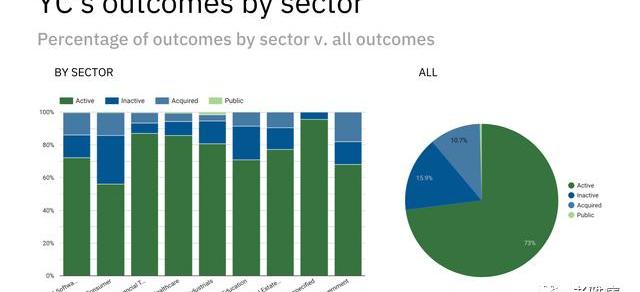 正如你所料,大多數成熟的公司最終要么被收購,要么關門大吉。在2015年之前的初創公司中,29%被收購,40%死亡,30%仍然活躍,1.4%已經上市。不同行業的結果差異很大,消費類初創企業的收盤速度大約是平均水平的兩倍。