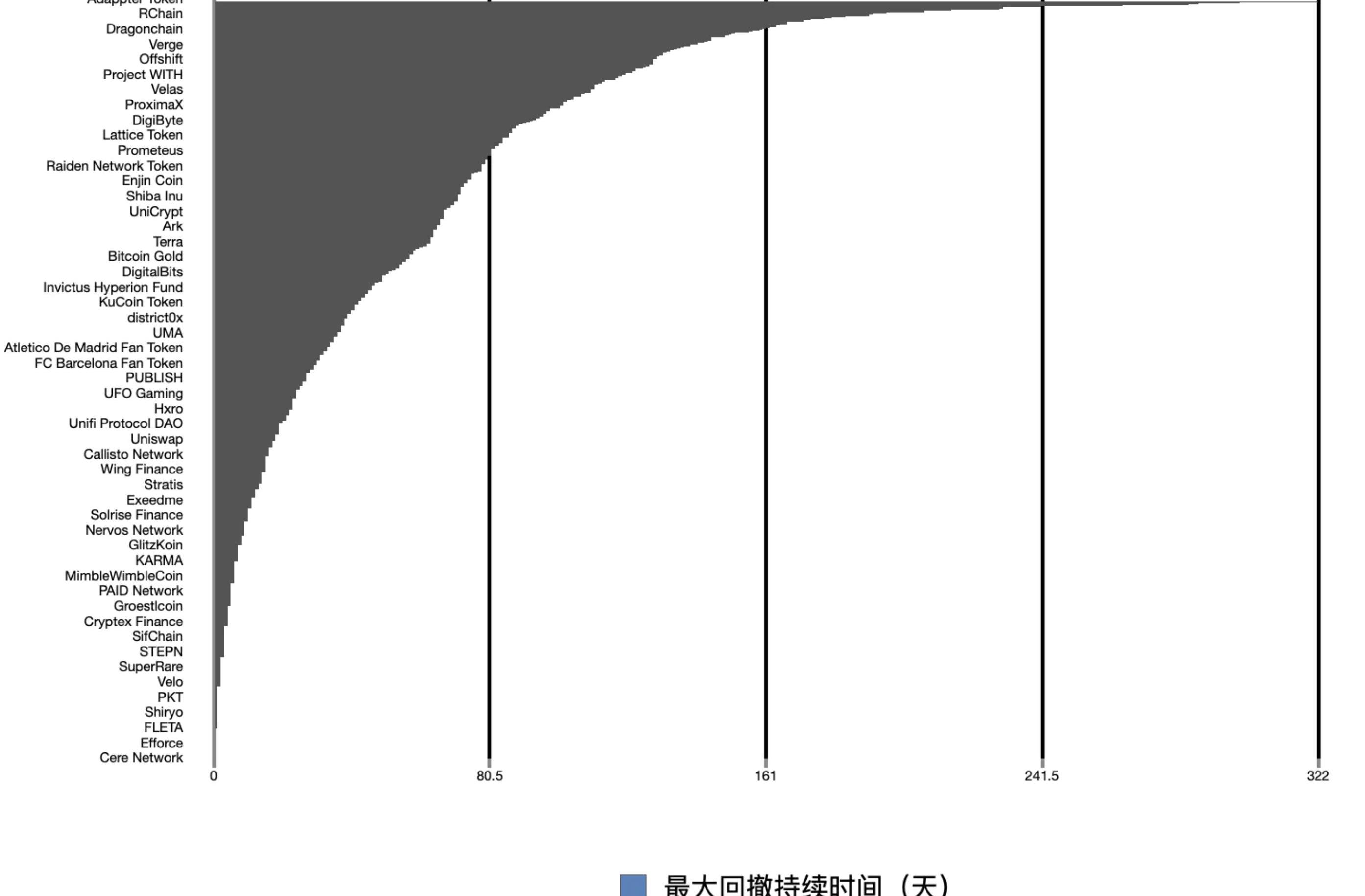 上圖是“最大漲幅的開始時間的頻數”,x軸為時間,y軸為頻數,圖中的柱表明:幣種都是在什么時間見底的。見底時間集中在2020年3月和2021年7月,也就是“312”和“519”慘案之后見底。
