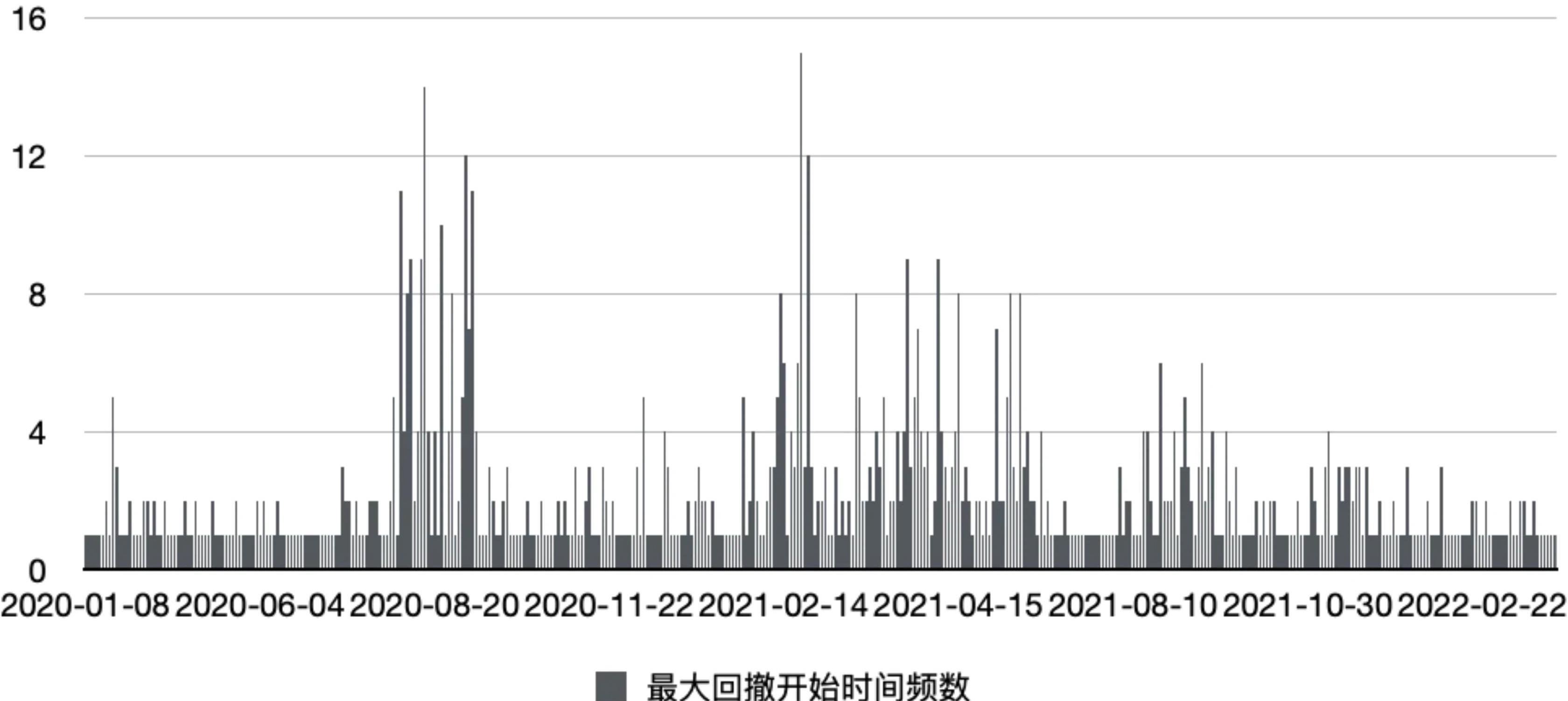 接下來我們統計一下最大回撤通常是什么時候發生的。下圖是最大回撤開始時間的頻數,圖中兩個明顯的波峰集中在2020年8月與2021年2-4月。