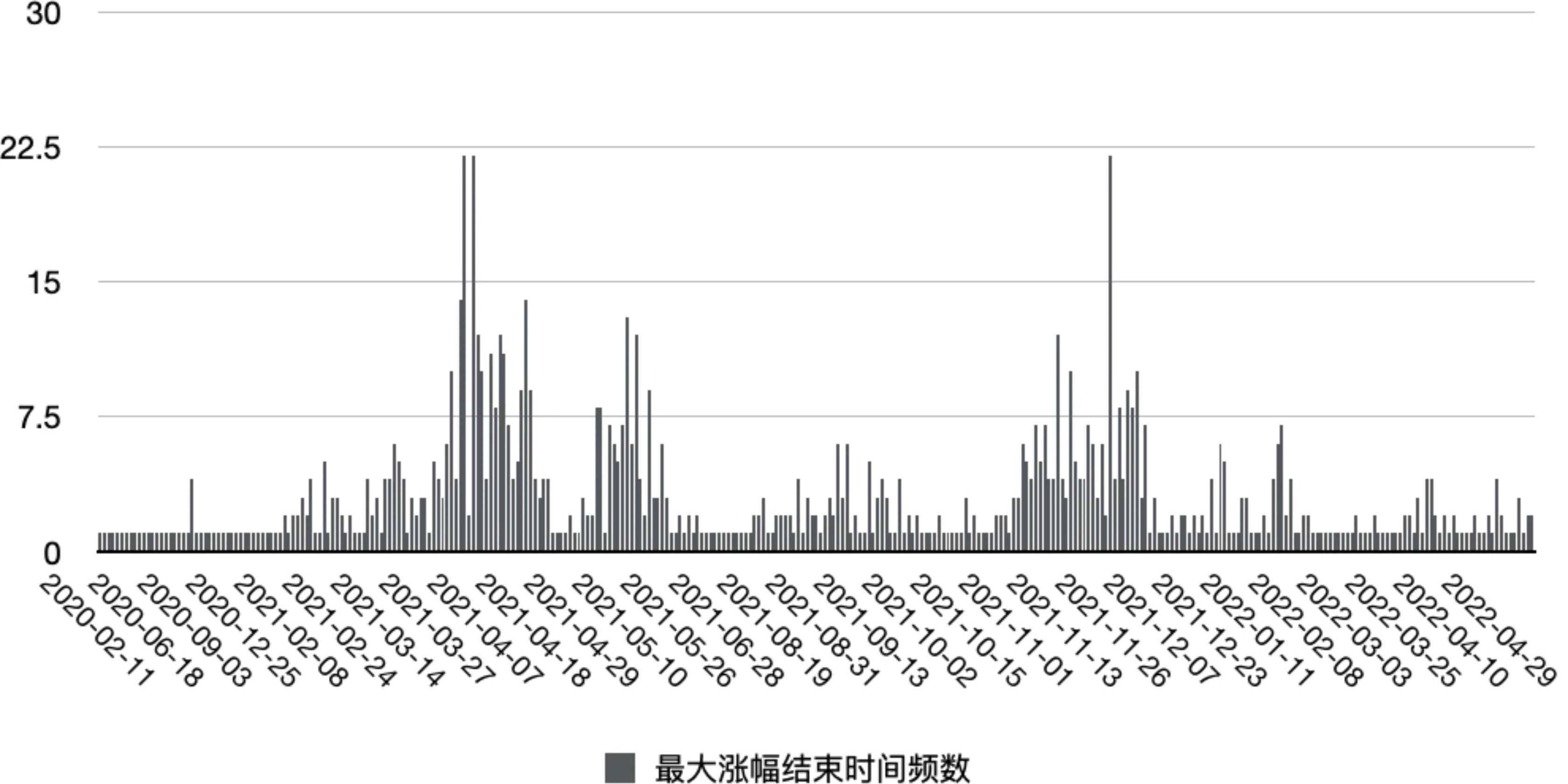 第二張圖是“最大漲幅的結束時間的頻數”,x軸為時間,y軸為頻數,圖中的柱表明:幣種都是在什么時間見頂的。絕大部分的見頂時間集中在2021年4月和2021年11月,與比特幣的見頂時間基本一致。