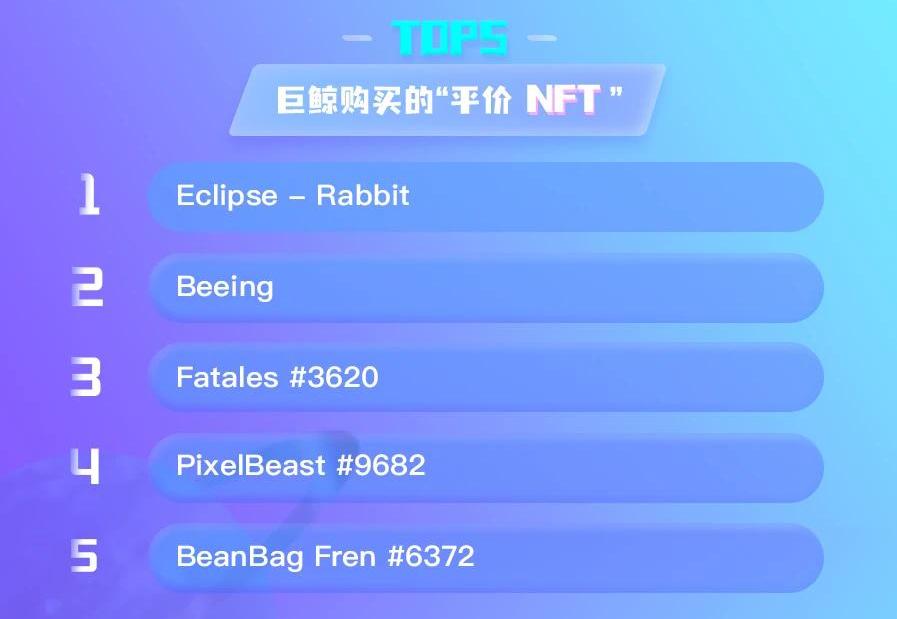 過去24小時,巨鯨購買的“平價NFT”中排前五的分別是:Eclipse-Rabbit、Beeing、Fatales#3620、PixelBeast#9682和BeanBagFren#6372。