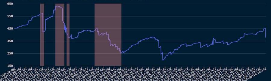 圖11:UST的價格和數量隨時間變化通過比較上圖顯示的UST的價格和交易量,我們發現5月8日的交易量明顯增加,與該代幣最初的價值損失同步。同樣,從Terra到Ethereum的歷史轉賬也在相同的日期前后顯示出明顯的活動。下面看到的峰值表明,大量的UST在脫錨期間通過跨鏈橋離場。