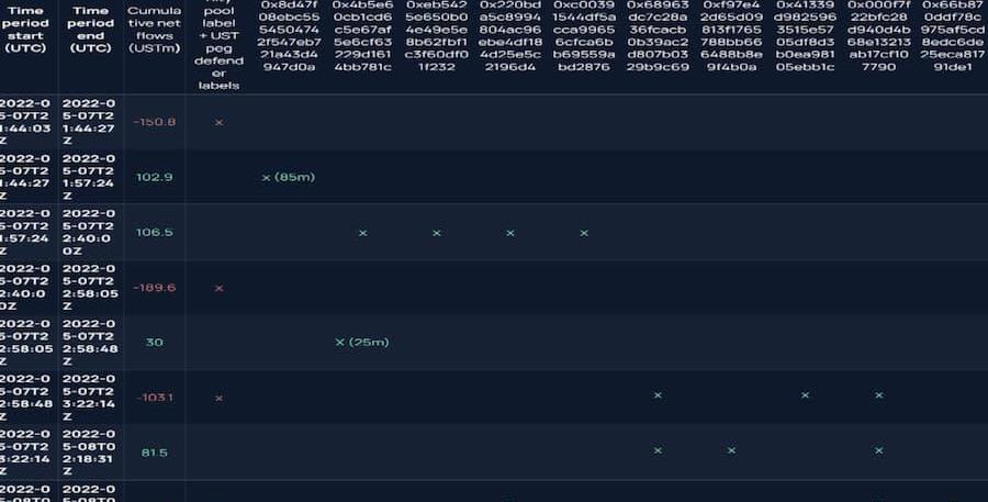 圖5:從脫錨的第一個跡象到Twitter新聞流的累積凈流量,按時間戳匯總到Curve池中大約在5月7日21:44至5月8日5:35期間,UST流入和流出之間的戰斗似乎加劇了。5月7日21:44UTC,一個與LunaFoundationGuard有關的錢包從Curve撤回了大約150百萬的UST。隨后,一個地址流入了約8500萬UST。四個地址中,其中一個與Celsius有關,緊隨其后,大約有1.05億的UST凈流入Curve。LFG和相關的「錨定保衛」錢包以1.896億美元的提現量進行護盤,來回折騰持續到5月8日上午。
