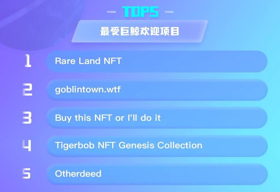 最受巨鯨歡迎項目排前五的分別是:RareLandNFT、goblintown.wtf、BuythisNFTorI'lldoit、TigerbobNFTGenesisCollection和Otherdeed。