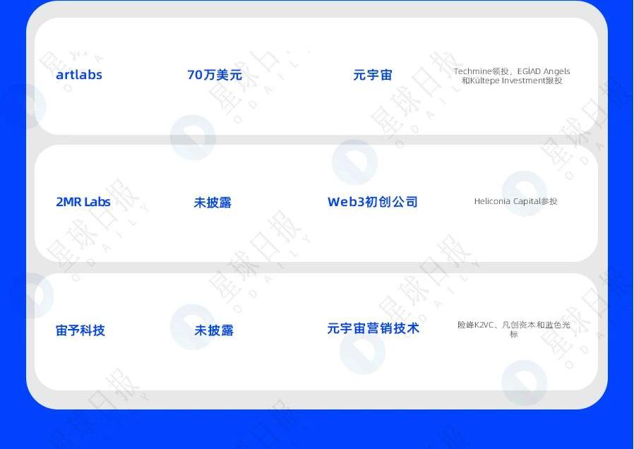 以下為具體融資事件:區塊鏈公司Ekta獲GlobalEmergingMarkets6000萬美元投資星球日報訊總部位于巴厘島的區塊鏈公司Ekta從紐約另類資產投資機構GlobalEmergingMarkets獲得6000萬美元融資。Ekta聯合創始人兼首席執行官BerwinTanco表示,“這些資金將用于Ekta生態系統的發展、為NFT市場和混合交易所提供流動性、開發Plant-to-Earn游戲MetaTrees、營銷、建立技術開發團隊和合作計劃。”據悉,Ekta正處于構建一套區塊鏈產品的早期階段,包括NFT市場、混合加密交易所、基于區塊鏈的游戲和房地產投資業務。其Layer1區塊鏈已全面運行。據悉,Ekta的主網EktaChain于2021年8月推出,將現實世界的資產代幣化。Web3游戲初創公司TheWildcardAlliance完成4600萬美元A輪融資,Paradigm領投獨立游戲工作室PlayfulStudios旗下Web3游戲子公司TheWildcardAlliance宣布完成4600萬美元A輪融資,Paradigm領投,GriffinGamingPartners、Polygon等參投。目前該公司即將推出一款多人在線戰斗競技游戲。加密經紀和托管機構Upvest完成4200萬美元B輪融資,BessemerVenturePartners領投加密經紀和托管金融機構Upvest宣布完成4200萬美元B輪融資,BessemerVenturePartners領投,Earlybird、ABNAMROVentures、NotionCapital、Partech、10xGroup、Speedinvest和MaximilianTayenthal參投。新融資將用于進一步開發和優化公司的API,擴大團隊規模,并為進行國際擴張奠定基礎。Upvest是歐洲少數同時擁有德國聯邦金融監管局證券、加密經紀和托管牌照的金融機構,主要利用API為終端用戶提供資本市場投資產品,包括ETF、股票、以及加密資產等。NFT基礎設施初創公司NFTPort完成2600萬美元A輪融資,Wise聯創Taavet與Teleport聯創Sten等領投NFT基礎設施初創公司NFTPort完成2600萬美元A輪融資,Wise聯合創始人Taavet與Teleport聯合創始人Sten以及歐洲風險投資公司Atomico共同領投。作為交易的一部分,Tamkivi還將作為聯合創始人加入NFTPort。籌集資金將用于擴展其平臺并支持更多區塊鏈。據悉,NFTPort總部位于愛沙尼亞,其通過基礎設施建設幫助開發人員快速構建基于NFT的應用程序。游戲開發商ClockworkLabs完成2200萬美元A輪融資,a16z領投游戲開發商ClockworkLabs宣布完成2200萬美元A輪融資,a16z領投,Supercell、Roblox創始人兼首席執行官DavidBaszucki、CCPGames首席執行官HilmarPetursson、Unity聯合創始人DavidHelgason等參投。ClockworkLabs將利用最新融資資金開發其社區沙盒大型多人在線角色扮演游戲BitCraft,并為游戲、Web應用程序和Web3App新數據庫技術提供支持。加密貨幣套利平臺Mosdex完成2000萬美元A輪融資,EvliBankPLC領投星球日報訊加密貨幣套利平臺Mosdex完成2000萬美元A輪融資,EvliBankPLC領投,LifelineVentures風投部門、NordicNinjaVC、PetteriSuorsa、MagnusEskelinen和JouniV?is?nen等參投。資金將用于在全球擴展,計劃在紐約、香港、新加坡、倫敦、東京和迪拜開設辦事處。Mosdex發言人表示,該公司希望將歐洲市場作為其首要目的地。該公司還將在今年晚些時候推出符合歐洲加密貨幣法規的加密貨幣套利解決方案。DAO平臺Molecule完成1300萬美元種子輪融資,NorthpondVentures領投星球日報訊為醫學研究項目募資的DAO平臺Molecule完成1300萬美元種子輪融資,NorthpondVentures領投,BackedVC、ShineCapital、Speedinvest以及前CoinbaseCTOBalajiSrinivasan參投。Molecule平臺是一個供研究人員上架代表知識產權的NFT項目的市場。目前該平臺上的項目包括紐卡斯爾大學關于分子衰老的研究,以及哥本哈根大學關于長壽的項目。這些項目通過DAO以穩定幣的形式獲得資金。元宇宙游戲開發商AtmosLabs完成1100萬美元種子輪融資,Sfermion領投、AnimocaBrands等參投元宇宙游戲開發商AtmosLabs宣布完成1100萬美元種子輪融資,Sfermion領投,AnimocaBrands、Collab+Currency、FBGCapital、LDCapital、AlumniVentures、RedBeardVentures、DWeb3、GSRMarketsLimited、CoinGeckoVentures、AvocadoGuild、UniXGaming等參投。新融資將用于建立虛擬游戲世界Atmos的基礎,發展其社區,并擴大Atmos團隊。據介紹,AtmosLabs旨在為用戶提供AAA質量的競技游戲和豐富敘事,在元宇宙內開發若干原生游戲運動項目,玩家可以在其中擁有自己的裝備、團隊。Web3創作者工具開發商Tellie完成1000萬美元融資,GalaxyDigital等參投Web3創作者工具開發商Tellie宣布完成1000萬美元A輪融資,MalibuPointCapital、GalaxyDigital、OsageVenturePartners、DapperLabs、SXSWInnovationFund、Gaingels、CorazonCapital、TQVentures、UpfrontVentures等參投。融資資金將用于在Polygon上推出TellieCollectionsNFT市場。Web3創企ScienceMagic.Studios完成1000萬美元Pre-Seed輪融資,Coinbase、AlanHoward參投星球日報訊Web3技術咨詢公司ScienceMagic.Studios宣布完成1000萬美元Pre-Seed輪融資,CoinbaseVentures、DigitalCurrencyGroup和億萬富翁對沖基金經理AlanHoward參投。該公司由前GuardianMediaGroup首席執行官DavidPemsel領導,致力于為品牌提供如何利用NFT和社交代幣等Web3技術的建議,以增加與粉絲和社區的互動。Web3娛樂科技公司Kaleidoco完成700萬美元種子輪融資,AnimocaBrands等參投Web3娛樂科技公司Kaleidoco宣布完成700萬美元種子輪融資,AnimocaBrands、GameFiVentures、Gemini、JaneStreet、AditVentures、MeritCircle、Nexo、HexTrust、SuperChainCapital和TSG等參投。Kaleidoco公司創造原創增強現實(AR)體驗的Web3娛樂服務,最近在TED2022開幕式上推出2.5維混合顯示元宇宙ParticleInk,該公司增強現實多視圖技術正在申請專利,他們還計劃在年底前推出首個ARNFT集合。*遺囑和遺產服務公司Willed完成600萬美元A輪融資,將拓展加密貨幣等業務遺