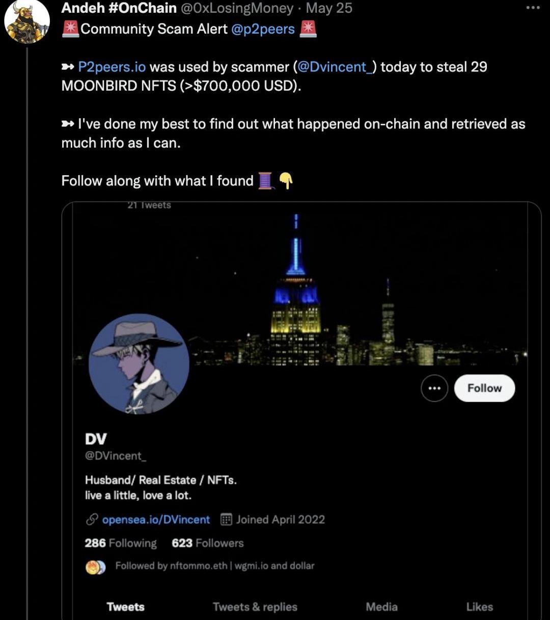 5月25日,推特用戶@0xLosingMoney稱監測到ID為@Dvincent_的用戶通過釣魚網站p2peers.io盜走了29枚Moonbirds系列NFT,價值超70萬美元,釣魚網站目前已無法訪問。該用戶表示,域名sarek.fi和p2peers.io都曾在過去的黑客事件中被使用。