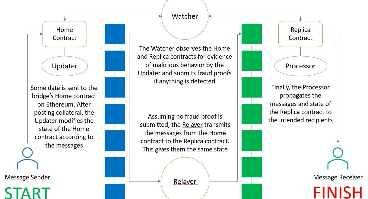 這種特殊類型的跨鏈橋利用位于不同鏈上的兩個合約地址以及四個接受激勵的鏈下不同參與者,實現跨鏈發送消息。該類別中最著名的協議或許是Nomad,它使得多鏈應用程序實現更輕松地跨區塊鏈生態系統進行通信。讓我們通過一個從以太坊向Polygon發送消息的簡化示例來解釋它的工作原理: