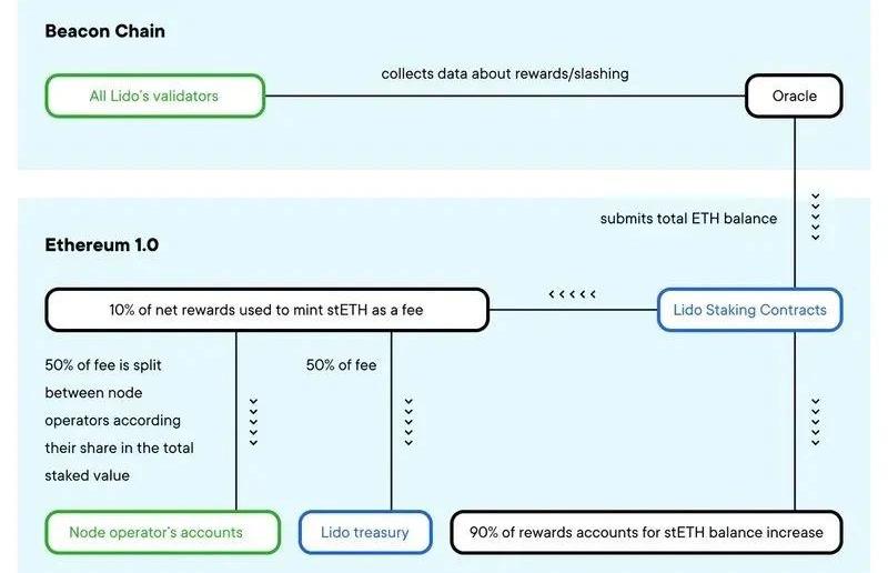 Lido的以太坊質押底層機制來源:LidoBlog2、質押池質押池是協議中的最重要的智能合約。用戶通過與該合約交互實現存取加密資產、鑄造或者焚燒st資產。質押池使用節點運營商的地址和驗證密鑰將存款統一的輪流分配給節點運營商。質押池合約還負責將費用分配給LidoDAO國庫和節點運營商。3、LidoOracleLidoOracle是一個合約,oracle會把由DAO控制的地址的余額發送到ETH2.0方。LidoOracle負責跟蹤質押余額。凈質押獎勵會每天發送給質押池合約。質押池通過鑄造成比例的st資產,來分配凈質押獎勵的10%:5%分配給節點運營商,5%分配給LidoDAO國庫。剩余的90%凈質押獎勵歸st資產所有者。根據網絡的不同,質押獎勵會顯示為st資產的余額增加或者兌換比率的增加。