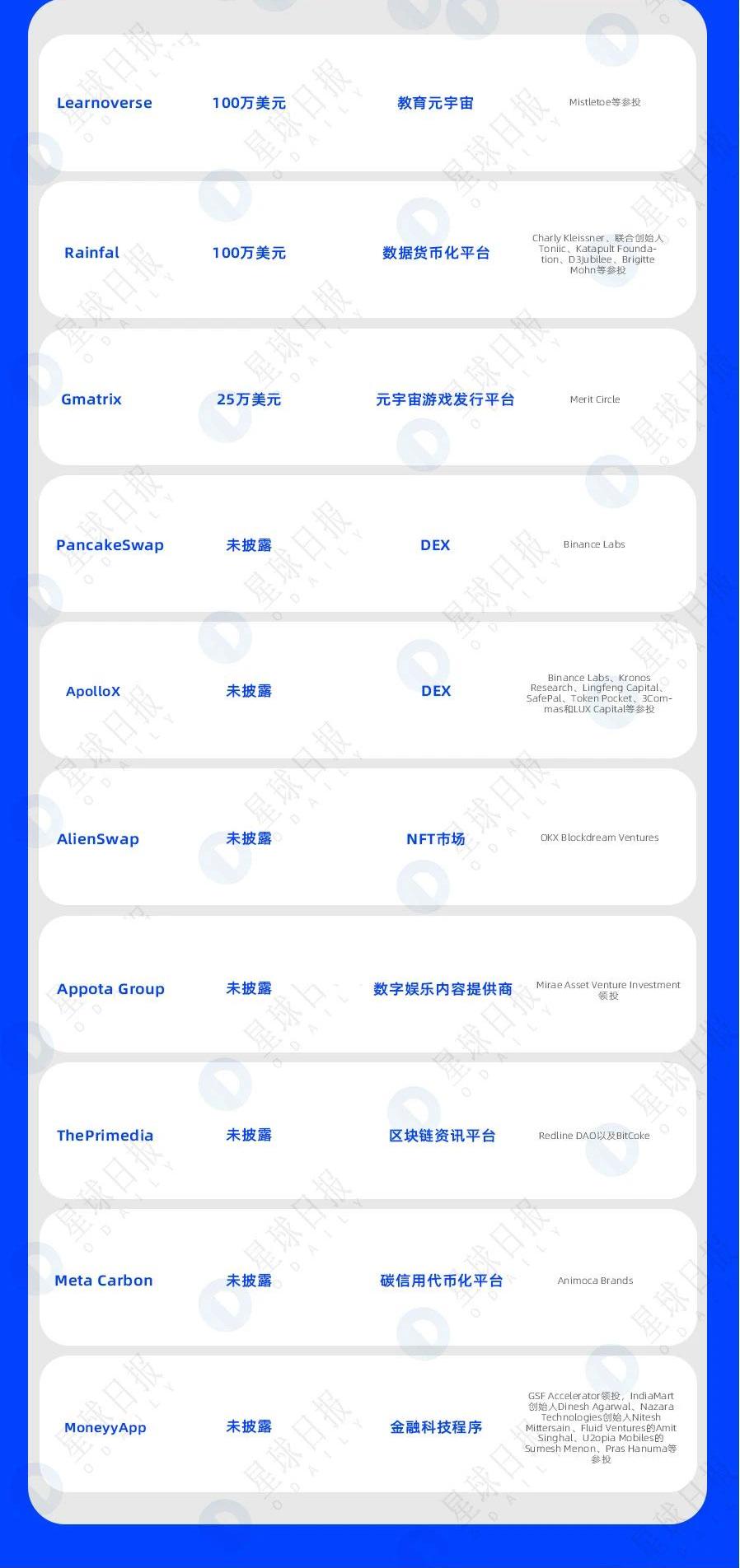 以下為具體融資事件:加密交易所Pintu完成1.13億美元B輪融資,Lightspeed等參投印度尼西亞加密貨幣交易所Pintu完成1.13億美元B輪融資,投資方包括風險投資機構IntudoVentures、LightspeedVenturePartners、PanteraCapital和投資咨詢公司NorthstarGroup。據悉,Lightspeed在去年8月份領投Pintu3500萬美元的A輪擴展融資。*沉浸式電商解決方案Nfinite完成1億美元B輪融資SaaS模式的沉浸式電商解決方案Nfinite宣布完成1億美元B輪融資,InsightPartners領投,原投資方USVenturePartners等參投。據悉,Nfinite將使用該筆資金擴大公司業務,以推動其基于SaaS的視覺電子營銷平臺的市場擴張和3D化。此外,Nfinite還將提供與Web2和Web3應用程序兼容的視覺資產,以探索元宇宙方向的潛力。體育媒體制作公司RegionsofSports完成5000萬美元B輪融資,ShamrockCapital領投體育媒體制作公司RegionsofSports宣布完成5000萬美元B輪融資,ShamrockCapital領投,ElysianParkVentures、CerroCapital等參投。ReligionofSports首席執行官AmeethSankaran表示,公司的投后估值將超過1億美元,融資將用于拓展更多創新項目,例如為運動員創建NFT。據悉,RegionsofSports由TomBrady、MichaelStrahan和電影制片人兼企業家GothamChopra共同創立。射擊游戲SuperpowerSquad以5000萬美元估值完成私募融資,KuCoinLabs領投星球日報訊射擊游戲SuperpowerSquad以5000萬美元估值完成私募融資,KuCoinLabs領投,EVG、Ankr等參投。具體融資金額未披露。新融資將用于后續開發高級游戲模式和桌面版本,以及擴大其在GameFi領域中的影響力。據介紹,SuperpowerSquad是一款以超級英雄為主題的第三人稱射擊游戲,擁有超過60人的團隊。該游戲包括MOBA、RPG、Roguelike、社交聊天功能和排名系統等特征,以及PVP和PVE等其他游戲模式,擁有英雄、武器、皮膚等多種資產。目前其測試版已上線Android平臺,iOS版本也將于近期推出。數字資產服務提供商Coinhouse完成4250萬美元融資,ConsenSys等參投數字資產服務提供商Coinhouse宣布完成4000萬歐元融資,ODDOBHF和TrueGlobalVentures4Plus領投,TiogaCapital、XAngeSiparexInnovation、RaiseVentures、CFPartners、ConsenSys、ExponCapital等參投。融資將用于開發加密資產管理產品,加速其國際擴張,以挖掘外部增長機會,包括讓個人和企業更直觀、更易于使用加密支付,以及通過Web3簡化交易和數字資產管理。DeFi借貸協議EulerFinance完成3200萬美元融資,HaunVentures領投基于以太坊的DeFi借貸協議EulerFinance宣布完成3200萬美元融資,HaunVentures領投,Variant、FTXVentures和JumpCrypto等參投。據悉,EulerFinance使用了一種框架式的借貸風險評估方案,團隊將于今年晚些時候推出DAO,使用戶能夠對Euler的開發和運營進行治理,并決定如何使用其社區金庫。加密社交平臺Calaxy完成2600萬美元融資,AnimocaBrands和HBARFoundation領投由NBA球星丁威迪創建的加密社交平臺Calaxy宣布完成2600萬美元融資,AnimocaBrands和HBARFoundation領投,Polygon參投。據悉,Calaxy將搭建一個基于區塊鏈底層技術的用戶向社交平臺,粉絲可以通過視頻消息、在線課程、視頻通話和粉絲俱樂部訂閱等方式與知名創作者建立聯系,內容訂閱可以使用Calaxy的原生TokenCLXY購買。Postmates創始人旗下加密公司TiptopLabs完成2300萬美元A輪融資,a16z領投Uber收購的送餐服務公司Postmates創始人BastianLehmann成立的加密貨幣公司TiptopLabs上月完成2300萬美元A輪融資,AndreessenHorowitz領投,SamAltman、NavalRavikant、GokulRajaram、ScottBanister、CyanBanister、NabeelHyatt、DanRomero、JudeGomila、SeanPlaice、AndyMcLoughlin、JeffClavier、VivekPatel等參投。區塊鏈農業技術公司Agrotools完成2100萬美元融資,KPTL等參投巴西區塊鏈農業技術和數據分析公司Agrotools宣布完成2100萬美元融資,公司估值約為9400萬美元。HorácioLaferPiva、PedroPauloCampos、FátimaMarques、PauloHegler、OlivierMurguet、KPTL、FIPInovabra、RonaldoGalvaniJr參投。Skolem完成2000萬美元A輪融資,GalaxyDigital領投數據和交易執行服務提供商Skolem宣布完成2000萬美元A輪融資,GalaxyDigital領投,Point72Ventures、JumpCrypto、Fenwick、West、MorpheusVentures和DragonflyCapital參投。籌集資金將用于擴充團隊并提高該公司的技術能力,以進一步幫助機構訪問DeFi。去中心化交易協議OrderlyNetwork完成2000萬美元融資,紅杉中國等參投星球日報訊去中心化交易協議OrderlyNetwork宣布完成2000萬美元融資,ThreeArrowsCapital、PanteraCapital、DragonflyCapital、SequoiaChina、JumpCrypto、AlamedaResearch、GSRMarkets、SevenXVentures、MetaWeb.VC、IOSGVentures等參投。融資將用于招聘員工、開發新產品和現有產品以及建立新的合作伙伴關系。加密稅務與會計平臺Ledgible完成2000萬美元A輪融資,EJFSilvergateVenturesFund領投加密稅務和會計平臺Ledgible宣布完成2000萬美元A輪融資,EJFCapital旗下EJFSilvergateVenturesFund領投,JAMFINTOP、ThomsonReutersVentures、TTVCapital、FenbushiUS、CommerceVentures、NathanMcCauley和PerkinsCoie等參投。據悉,Ledgible加密稅收和會計平臺支持跨主要區塊鏈、加密貨幣交易平臺、錢包和專業會計工具的集成,能夠確定加密稅收與賬目,并將該數據提供給專業稅務申報系統以及總賬會計系統。Ledgible將使用該筆投資擴大產品線并擴充團隊,以支持更多的機構合作伙伴和會計師事務所。去中心化軟件組織PartyDAO完成1640萬美元融資,a16z領投據官方公告,去中心化軟件組織PartyDAO完成1640萬美元融資,a16z領投。據悉,PartyDAO運營著NFT組團競標平臺PartyBid,目前已發布PartyBidV1版本,PartyBid的目標是讓人們將他們的資金集中在一起,以團隊的