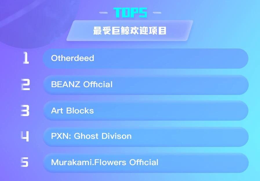 最受巨鯨歡迎項目排前五的分別是:Otherdeed、BEANZOfficial、ArtBlocks、PXN:GhostDivison和Murakami.FlowersOfficial。