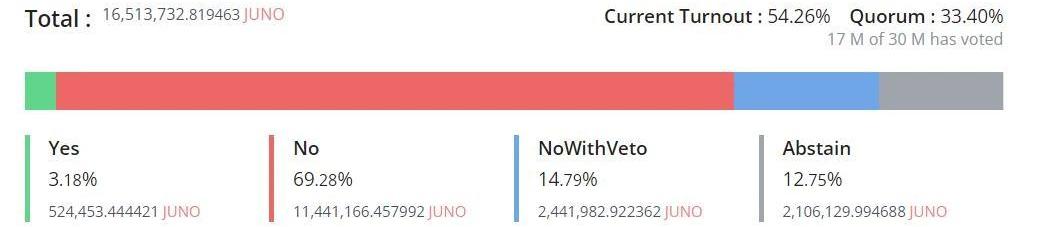 來源:JunoNetwork官網即便規定了“鯨魚上限”,一日本鯨魚還是借助創世空投漏洞博取了大量JUNO廉價籌碼。據背景調查,鯨魚是一家日本基金,業務是托管經營其日本客戶的ATOM錢包,因此匯集了大量ATOM資產。鯨魚通過將大量ATOM資產拆分為50個錢包來博弈Juno空投規則,從而規避了Juno空投設定的5萬顆上限,最終從50個地址收集了250萬顆JUNO代幣到一個單一地址。巨鯨鏈上地址一系列操作:https://docs.google.com/spreadsheets/d/1McQE3Ot-QkAElou6_Qs1TS9ZaCHeTVp0dYRAWZ7TOYM/edit#gid=0這一行為很快被JunoCore-1團隊監測到,C1隨后發起4號提案:https://www.mintscan.io/juno/proposals/4。提案解釋了該地址打破了“每個實體最多獲得5萬顆JUNO”的規則,提議消減該地址90%的JUNO余額,以避免籌碼集中化和傾銷問題。然而在提案投票期間,鯨魚聯系了@wolfcontract,表明自己是一家日本基金,并承諾會將非法得來的JUNO空投質押來支持網絡安全。整個事件的詭異之處就在于,當時Juno團隊接受了鯨魚的口頭承諾。這種嘗試建立“默契的契約關系”的話術,竟在信任感更脆弱的web3世界起了效果。Wolfcontract接受了巨鯨的道歉,并在推特上發表意見,整個社區也接受了巨鯨的承諾,4號提案最終以56.4%的反對率失敗,社區逐漸遺忘了巨鯨的潛在威脅。但近幾個月來,巨鯨開始大量傾銷JUNO,16號提案發生前,鯨魚每天賣出1.7萬顆JUNO換成OSMO,再從OSMO換成ATOM,并將ATOM發送到新地址上。巨鯨在鏈上地址的行為明顯背棄了其最初承諾,此舉再次引發了社區的恐慌。這促使Wolfcontract和Core-1團隊于3月11日發起16號提案重新訴訟鯨魚:https://www.mintscan.io/juno/proposals/16。提議將巨鯨的52個賬號持幣數量從300萬枚消減至5萬枚,并向社區財庫轉移同等數量的資金。這一提案的發布,引爆了Juno代幣持有者的討論,Juno因此出圈,在推特上獲得熱烈討論,很多人因此了解Juno巨鯨事件。我整理了Juno提案事件中主要意見人物的list:https://twitter.com/i/lists/1509897211739799552?s=20。3月11日,提案發布的第一天,支持率曾超過90%,支持率一度碾壓反對率;3月15日,JunoNetwork開發團隊Core-1發推表示,希望社區成員對有關移除巨鯨賬戶資產的16號提案投反對票,并將制定新的提案以提供更多的替代性解決方案;3月16日凌晨,Cosmos生態智能合約平臺鏈JunoNetwork關于移除巨鯨賬戶資產的16號提案最終獲得通過,最終提案投票率創98.58%,其中40.85%的投票者同意該提案。投票結果分布如下: