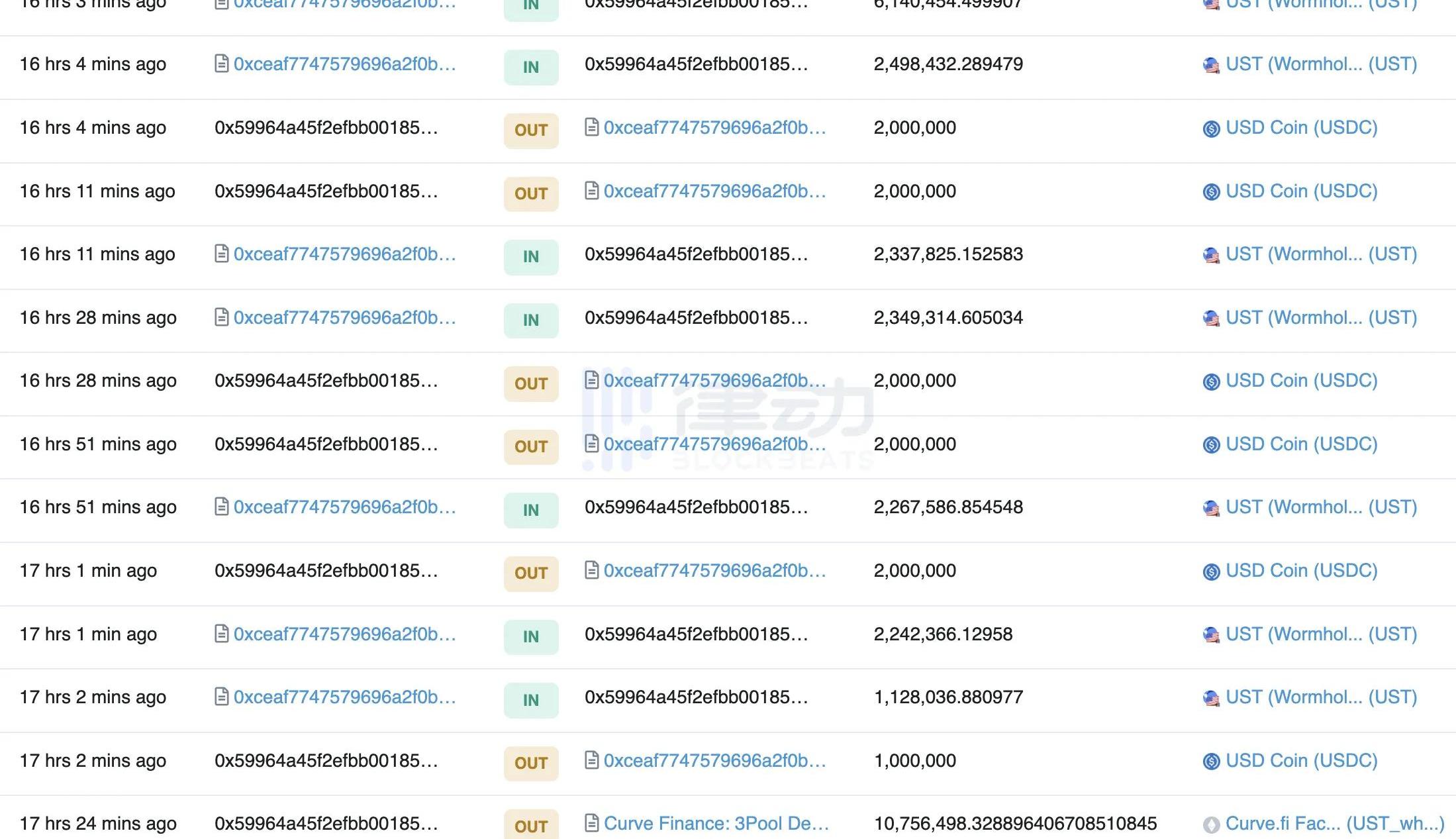 隨后,一個以「0x599」開頭的地址開始大規模吸收市場上流通的UST,金額超2億美元。