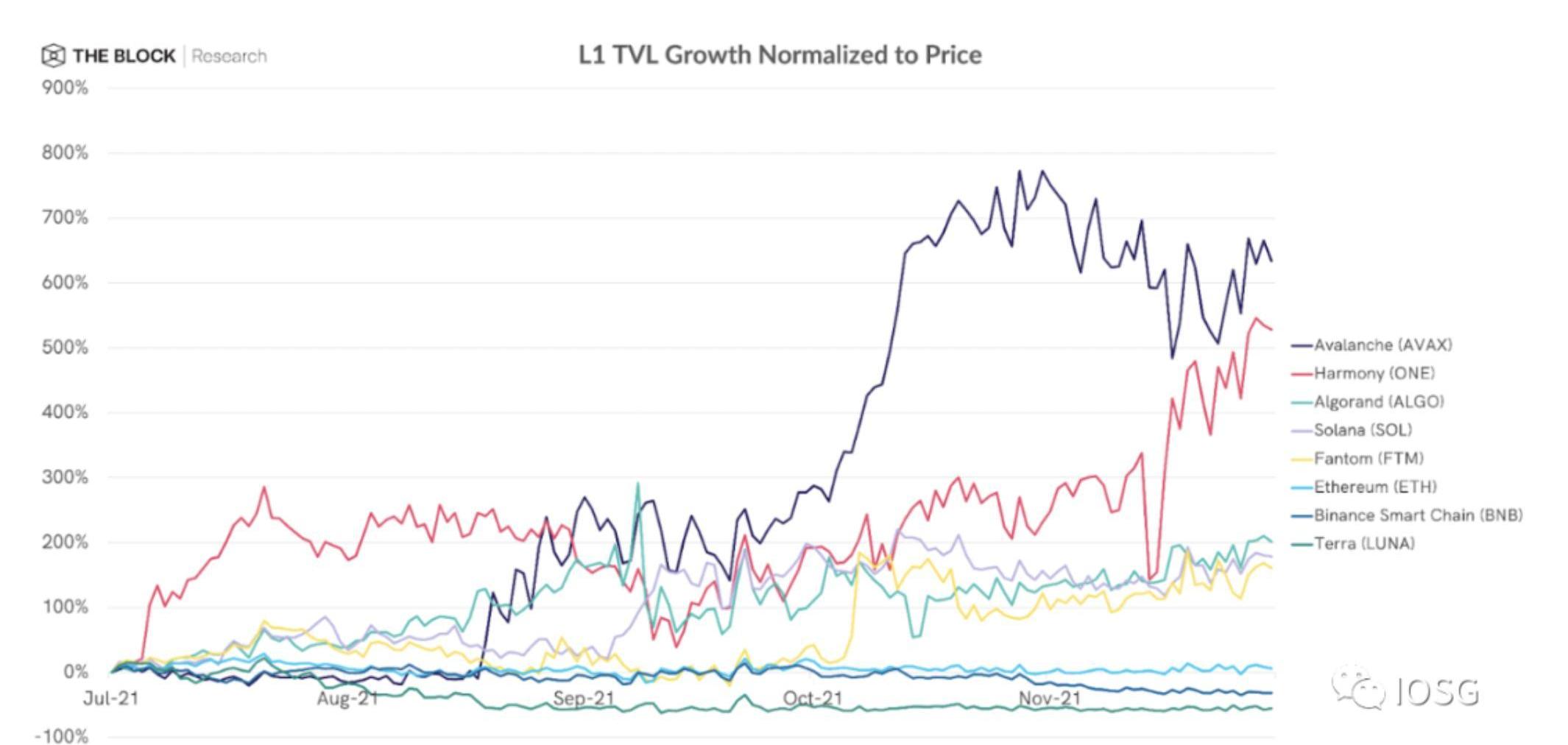 DeFiMap;來源:IOSGVentures多鏈DeFi擴張一直是2021年的DeFi發展的新焦點。其中BSC-Chain、Polygon、Terra、Avalanche和Solana也做了諸多討論,雖然這些鏈大多定位為以太坊的競爭對手,但Polygon領導層和社區選擇支持以太坊的最大敘事,甚至宣布了一個雄心勃勃的推廣路線圖,并自己定位為模塊化區塊鏈方法的引領者之一。由于現有以太坊原生擴展解決方案的進展較慢,這為其競爭對手占領部分市場份額打開了一定的機會窗口。雖然TVL被最廣泛地被用于定義個人鏈上活動的業務量指標,但該指標也有一定的缺陷。因為通常大部分TVL是來自于特定L1的原生代幣,因此原生代幣的價格上升自然會導致TVL的增長,然后這又會進一步致使投機者抬高代幣價格。正如TheBlock在下圖展示的,可以看出Avalanche有最大的新鮮資本流入到該生態。
