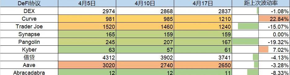 本周TVL出現9.67B的下降,下跌幅度為4.38%,整體變動情況與BTC和ETH變化基本趨同,自4月2日開始以連續下降20B,約10%。各公鏈TVL占比情況