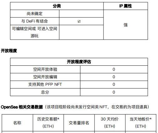 下面將按不同分類以及元宇宙開放程度,對上述項目做具體的分析。分類方式介紹:將對項目分為“可編輯空間或可進入空間游玩”,“與DeFi結合”,“尚未確定”三個大類別;同時將根據“具有本身明確世界觀與故事性”和“開放性強、包容程度更高”分為強IP屬性元宇宙以及弱IP屬性元宇宙。元宇宙開放程度介紹:將根據是否可以“空間開放體驗”,是否可以“空間開放編輯”,以及是否可以“支持其他PFPNFT”三個方面進行評估。其中可以“空間開放體驗”得2分,否則為0分;可以“空間開放編輯”得1分,否則為0分,可以“支持其他PFPNFT”得2分,否則為0分。分類二: