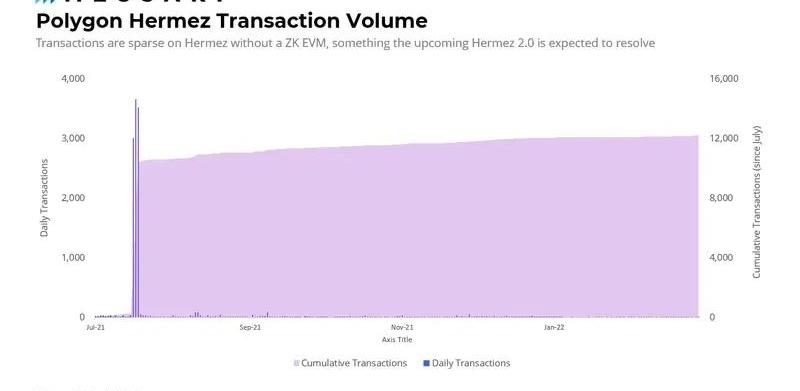 PolygonHermez:去中心化的和活躍的2021年8月,Polygon宣布以2.5億美元收購Hermez,這是迄今為止最大的區塊鏈網絡并購交易之一。該交易是通過公司代幣庫中的Polygon原生MATIC代幣融資的。Hermez原生代幣(HEZ)的先前持有者能夠以3.5MATIC代幣對1HEZ代幣的比率將他們的代幣兌換為MATIC。收購的結果意味著Polygon將負責新成立的實體PolygonHermez。在Polygon套件中的四個ZKRollup中,PolygonHermez是使用最活躍的。這是第一個在以太坊主網上運行的開源去中心化ZKRollup,并且自2021年3月起向公眾開放。用戶將資金部署到rollup網絡中,可以快速、廉價地在它們之間發送資金錢包作為轉賬和付款。PolygonHermez每秒能夠處理多達2,000筆交易,隨著以太坊在TheMerge之后的2023年某個時間實施分片,預計這一數字還會更高。無論如何,與一般的主網gas費相比,該產品目前的效果是降低了90%以上的交易成本。