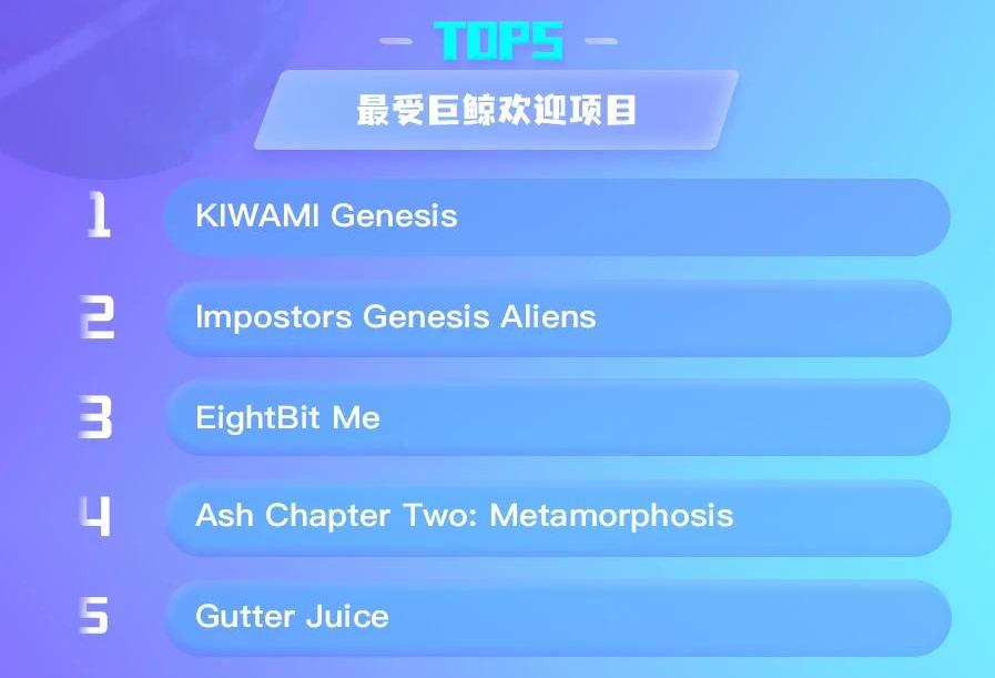 最受巨鯨歡迎項目排前五的分別是:KIWAMIGenesis、ImpostorsGenesisAliens、EightBitMe、AshChapterTwo:Metamorphosis和GutterJuice。