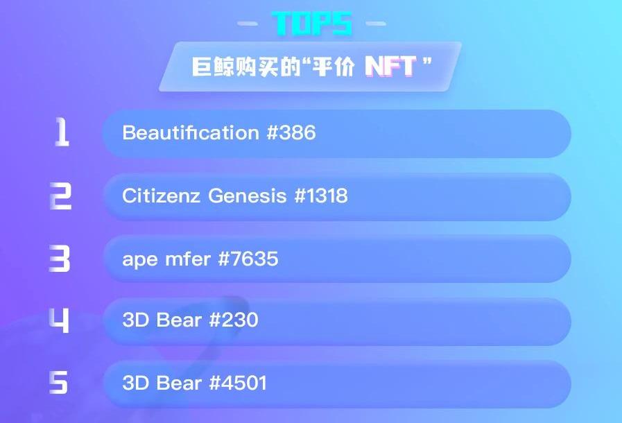過去24小時,巨鯨購買的“平價NFT”中排前五的分別是:Beautification#386、CitizenzGenesis#1318、apemfer#7635、3DBear#230和3DBear#4501。