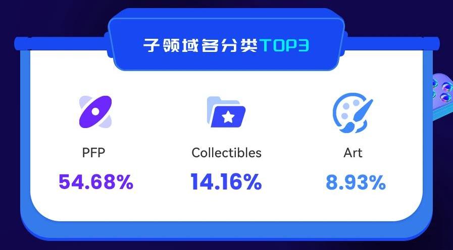 按市場占比,排前三的子領域分別為PFP、Collectibles、Art。