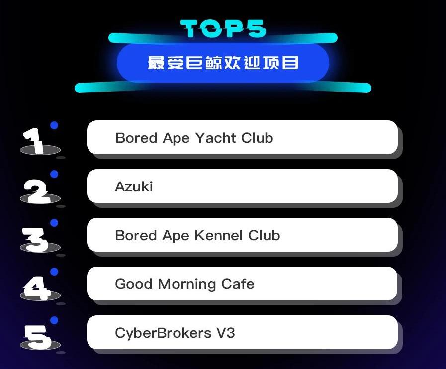最受巨鯨歡迎項目排前五的分別是:BoredApeYachtClub、Azuki、BoredApeKennelClub、GoodMorningCafe和CyberBrokersV3。