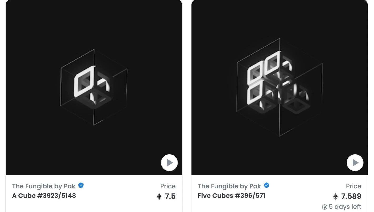 TheCheap和TheExpensivePak在這系列作品中嘗試思考和探索藝術品的價值內核,這些完全相同的藝術作品都是「真跡」,收藏家為何愿意為它們支付完全不同的價格?此外,它們背后有同樣的存儲文件,這份文件該屬于誰?Pak也在向NFT所有權的概念發起挑戰。TheFungible:同質化的非同質代幣