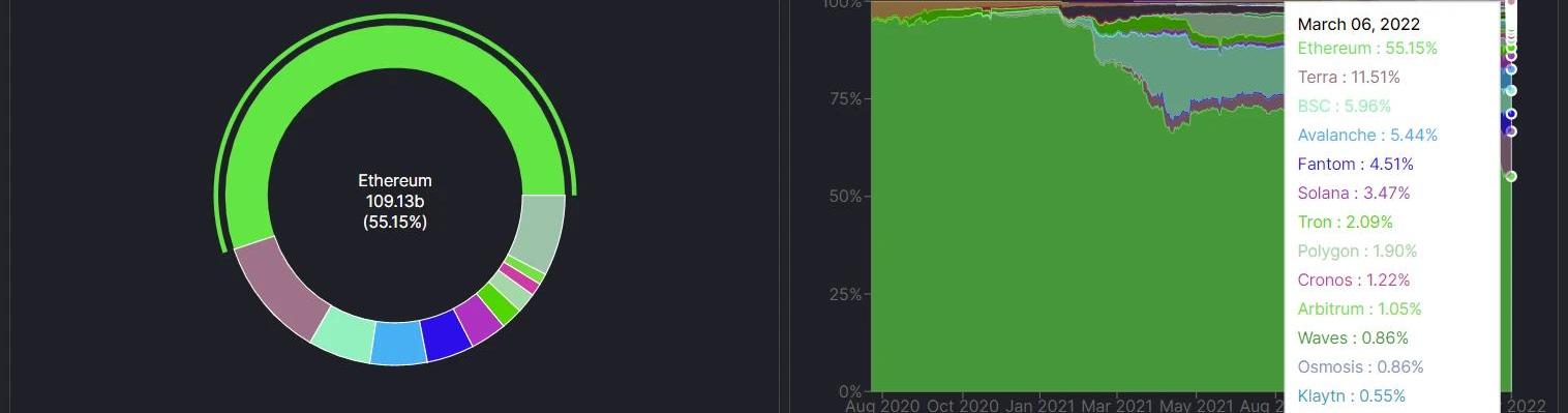 本周ETH鏈占比出現小幅度回升,從上周的54.8%上升至55.15%,占比上升0.35%,Terra鏈占比繼續上升,由9.87%上升至11.51%,單周增長1.64%,突破歷史新高點。ETH鎖倉量情況