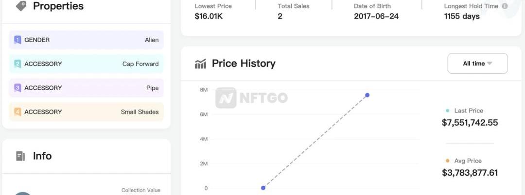 數據來源NFTGO在經歷了這一周后,Punks的整體熱度與交易量明顯較先前又提高了不少,這同時也帶動了整個NFT界地板價的飆升。但我們可以知道,Punks的熱度已逐漸蔓延至非NFT用戶,而這將會是一個長期的項目利好信息。成交最高價、均價與最低價來看下一部分指標:當前Punks的最高成交價為7,560,180.43美元,最低價為0美元,交易均價為70,439.4美元。成交價格跨度較大,有一定風險。但考慮到項目知名度高,可能有非贏利性交易的情況存在。整體來看,CryptoPunks項目內NFT價格較高,但整體最新交易價均為最高價,或許仍有一定的升值空間。