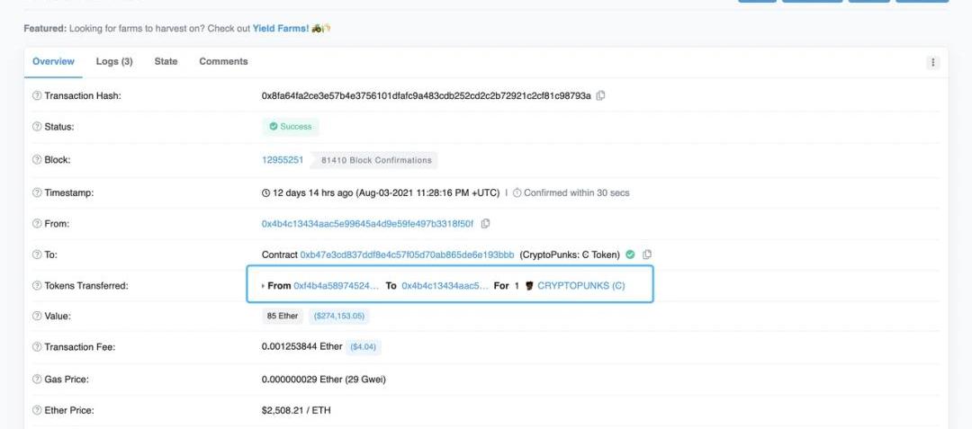 數據來源Etherscan8月7日新交易記錄的出現一定程度上可以說是1日熱度的延續,交易均價較1日有大幅增加。此外,8月6日,佳士得正式公布了含CryptoPunks在內的幾個NFT拍賣品的名單,作為利好消息推動了Punks的交易量飆升。當天同時還包含了一筆1500ETH的高額交易。