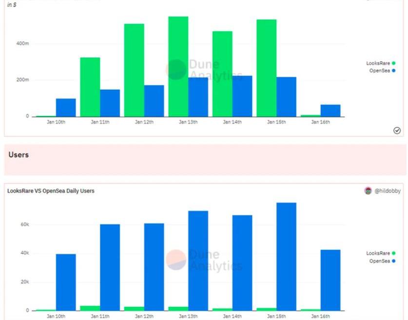 荷蘭東印度公司是世界第一家股份制公司,以集資形式建立的。此后,這種組織形式的企業廣泛流行于資本主義世界各國。人活著就是在對抗熵增定律,生命以負熵為生。——薛定諤秩序的建立是需要消耗能量,而股份制最奇妙的是通過信用,從未來借調能量到當前來使用,建立秩序,秩序再產能能量,這是一場跨越時空的Crypto常見的正循環驅動,這是無中生友的魔術手。而代幣,是更好的魔術手。2014年,滴滴和快的展開了堪稱互聯網史上最瘋狂的補貼戰爭,此后的一段時間里,滴滴總共燒掉了1500億,才算暫時坐穩出行帝國的江山。除了這個最典型的案例,在團購、外賣、共享單車上,互聯網的補貼大戰從來沒有停止過。而所有的這些補貼都是獨角獸企業先通過資本市場融資獲得,最后壟斷市場之后,由用戶買單的。售賣股份--優惠券--用戶代幣--用戶在補貼大戰上,代幣作為一個成本與時間效率更優的工具,在Crypto行業首先全面爆發了。2020年Defi的關鍵詞挖礦,憑借著代幣的這個優勢全面成為市場主流。當然挖礦并不是一個新鮮玩意,早在2018年Fcoin帶領的交易挖礦就在市場引起了一陣風潮,但是相對來說,流動性挖礦的意義更深遠。以之前NFTMarketplace比較火的Lookshare為例,可以看到Looksshare用Opensea5%的用戶實現了Opensea250%的交易量,從Collection看,刷量交易占了99%。