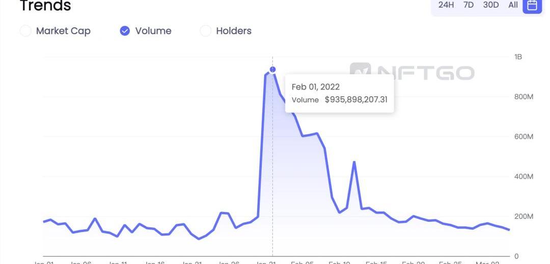 數據來源:NFTGo.ioNFT交易量在2月1號達到過去一年頂峰,單日交易量達到9億美元。月末交易量大幅下滑近76%,約為1.3億美元。