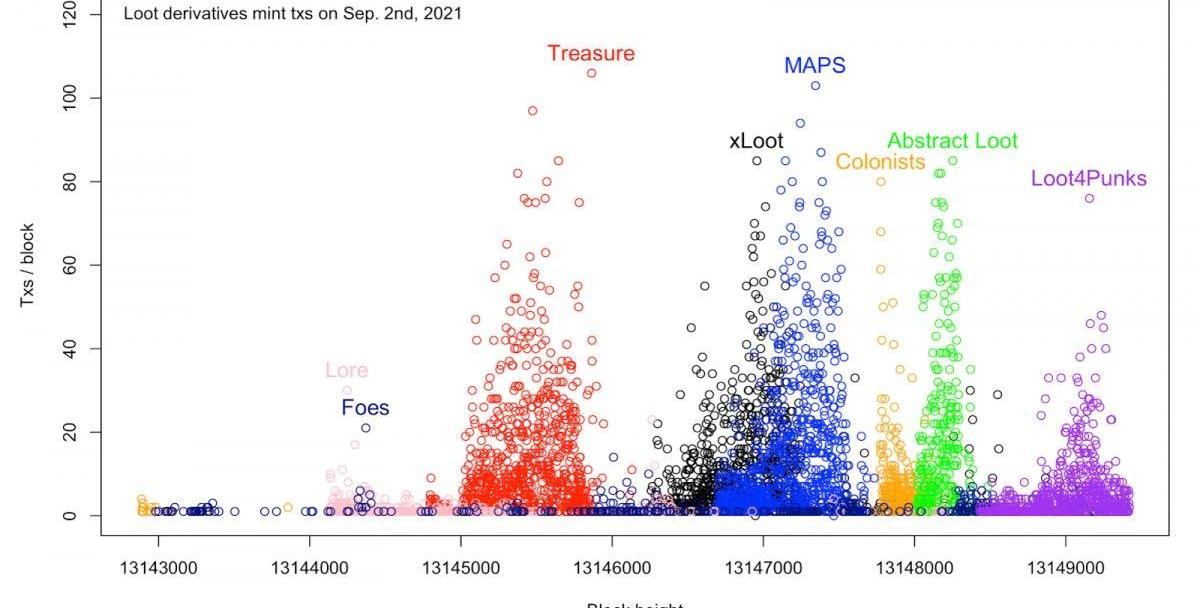XRP/HKD-0.75%2021年,NFT收藏品爆發成一個數十億美元的資產類別。然而,快速的成功也伴隨著一些“成長的煩惱”。大多數NFTDrop多使用先到先得機制,其固定價格遠遠低于市場價格。那這樣會導致什么問題呢?低價和過度需求有效地創造了競爭條件。在NFTDrop早期,買家的期待值很高,但只有最早的買家才有機會鑄造NFT。因此,哄搶導致對下一個區塊中的鑄造交易的需求上升,Gas費大幅增加。在需求高峰期,就會出現“Gas戰爭”。這在高需求NFTDrop期間給用戶帶來了很糟糕的體驗。比如,在Loot項目取得突破性成功后,急于mint和上市Loot衍生品導致gas費多次飆升,從而提高了整個以太坊網絡的交易價格。下圖顯示了去年9月2日,每當鑄造Loot品衍生品時,gas費是如何大幅上漲的。