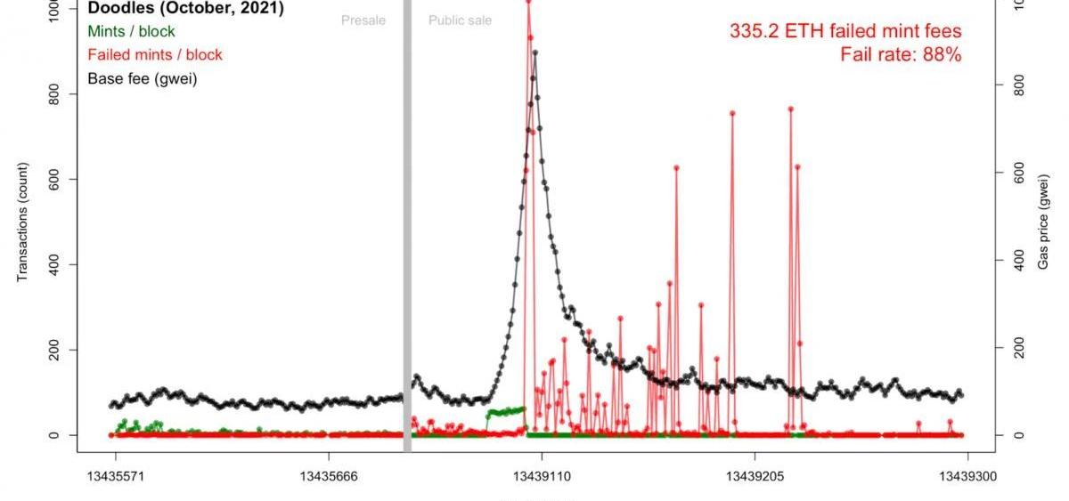 Doodles是2021年10月推出的一萬個獨特的個人資料圖片NFT的集合。Doodlesdrop有兩個階段:僅限白名單的FCFS鑄造階段和公共FCFS鑄造階段。在白名單階段,用戶可以隨時鑄造NFT,在基礎gas費相對穩定的情況下,很少有人交易失敗。一旦公開發售開始,人們爭先恐后地鑄造剩余的Doodles,對區塊空間的需求就會上升,而gas費用也會飆升。