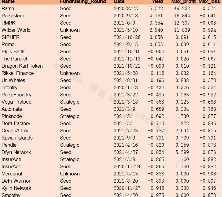 XRP/HKD+0.22%多數投資者喜歡追蹤項目的融資信息,以此作為項目資質的評判標準。本文詳細統計了自2020年7月以來的590個已發Token項目的融資信息,計算自融資信息公布以來的收益率、最大收益和最大虧損。從兩個角度呈現VC對投資者的借鑒意義。第一,從VC角度出發,列舉40家知名VC的投資情況,計算其損益。第二,從項目角度出發,篩選業績表現較好的項目,挖掘其背后的VC。之所以不統計2020年7月以前的數據,是因為當時的融資信息比較凌亂,大部分都沒有披露。本報告存在很大的局限性,需要讀者注意:非常重要的一點是,項目token的損益不是從發行日開始算起,而是從融資信息公布日開始算。以AxieInfinity為例,該項目發行至今上漲了超過300倍,a16z與Paradigm等一眾知名VC都參與了其B輪融資,但如果按發行以來的收益率計算就會高估他們的實際收益率。事實上,B輪融資是去年10月公布的,而Axie的暴漲發生在去年夏天,如果只計算10月以來收益率,那么真實數字為-50%。那么VC的真實收益率就是-50%?也不盡然!我們不知道他們的成本價,更不知道他們的退出價,也無法知道在不同項目的金額分配。因此用這種方式衡量VC的投資能力過于想當然了。本文計算的所有收益率均不代表VC投資業績,只是衡量融資信息對于投資者的參考價值。部分項目存在多輪融資,上述590個項目共有685條融資數據。所有融資數據均來自DoveMetrics,價格數據均來自CoinGecko,數據截至2022年2月10日。此外需要注意的是,對于頂級VC來說,投資收益曲線拉長,例如它們在2020年7月以前投資的一些項目,也會在這之后獲得高額回報,本文沒有進行相關統計。知名VC40家VC按照投資信息公布以來的收益率排序: