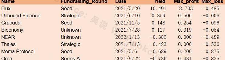 通過比較我們發現,這16家VC整體表現要好于上述40家。呈虧損狀態的VC僅6家,出現大幅回撤的僅5家,且大部分最大收益超過2倍。總結重申,以上所有收益率均不代表VC投資業績,只是衡量融資信息對于投資者的參考意義。投資者可以將融資背景作為項目優劣的評判標準之一,但不適合跟投,畢竟我們不知道VC的真實成本價和退出價。個人更喜歡將上述收益率當做“反向指標”來參考,即收益率較高的VC不一定能讓我為某個項目加分,但收益率較低的VC一定能讓我為其以后投資的項目減分。吳說:獨立可信的報道者歡迎在這里關注我們中文推特https://twitter.com/wublockchain12電報Telegram中文頻道https://t.me/wublock官方網站https://www.wu-talk.com/根據央行等部門發布“關于進一步防范和處置虛擬貨幣交易炒作風險的通知”,本文內容僅用于信息分享,不對任何經營與投資行為進行推廣與背書,請讀者嚴格遵守所在地區法律法規,不參與任何非法金融行為。吳說內容未經許可,禁止進行轉載、復制等,違者將追究法律責任。