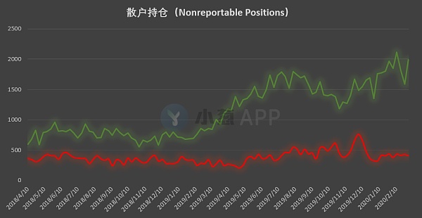 Bitfinex比特幣合約多空持倉數據由交易所實時更新,因此與每周延后更新的CFTC持倉報告相比,Bitfinex交易所持倉數據更能反映即時的市場散戶多空情緒變化。