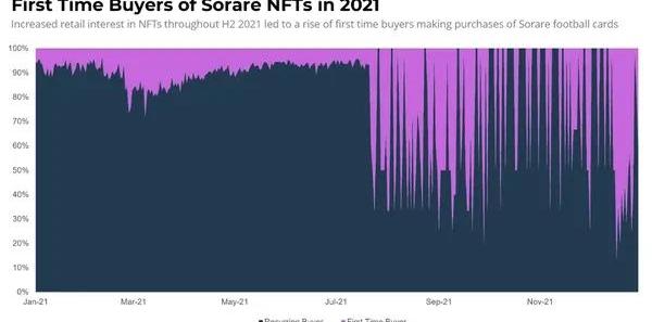 上圖:2021年1月以來,SorareNFT的首次買家(紫色部分)和重復買家(黑色部分)在其總買家的占比情況。Sorare追蹤真實世界的足球統計數據,獎勵那些持有高水平運動員的NFT卡牌的玩家。這款游戲的性質自然吸引了廣大的足球迷。如上圖顯示,SorareNFT的首次買家在2021年下半年大幅增加。2021年12月,SorareNFT的月獨立買家首次突破了2萬人。這里的數據需要說明的是,與AxieInfinity不同的是,Sorare玩家并不需要購買NFT才能開始玩游戲。這可能意味著Sorare玩家的總數量超過了進行NFT二級購買的人數。Sorare是迄今為止NFT與文化融合最成功的案例之一。有影響力的足球聯賽的參與,包括一些世界上最受歡迎的聯賽,如英超聯賽(EnglishPremierLeague)、西甲聯賽(SpanishLaLiga)和歐洲頂級的冠軍聯賽(ChampionsLeague),以及它們愿意將自己的品牌借給一款區塊鏈游戲,預示著未來將出現更多此類游戲。3.DeFiKingdoms