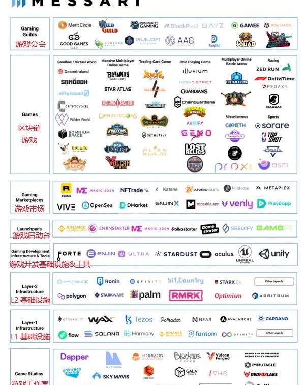 L1(第一層區塊鏈網絡)基礎設施是各種協議和應用的核心基礎。雖然一些游戲構建在有著更高吞吐量的L1區塊鏈(如Solana和Flow)之上,但大多數以太坊游戲已經遷移到L2解決方案中。L1的重要性來自于區塊鏈游戲將利用L1上的其他可組合的協議,包括公會、金融化協議(如NFTX)、身份解決方案(如以太坊域名服務ENS)、市場和其他應用或服務。8.游戲工作室游戲工作室位于基礎層,因為它們通常是游戲開發商,也是L1和L2基礎設施的開發者。DapperLabs(開發了CryptoKitties和NBATopShot等知名NFT項目)、SkyMavis(開發了AxieInfinity游戲)和AnimocaBrands(旗下的區塊鏈游戲包括TheSandbox和CrazyKings等)是擁有數億資金的最富有的游戲開發商。最終,并非所有游戲工作室都能生存下來。然而,那些開發下一款重磅游戲的公司有潛力成為未來的下一個ElectronicArts(藝電游戲公司)。06.區塊鏈游戲獲得廣泛興趣
