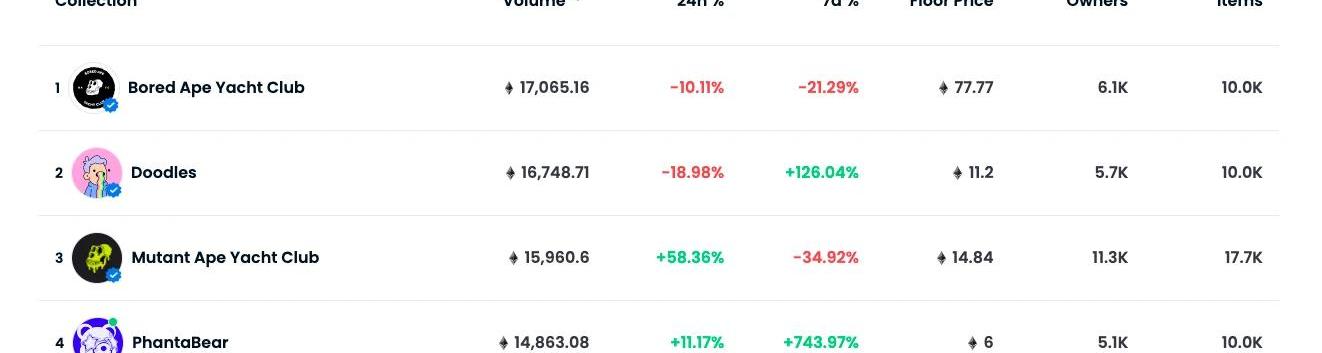 XRP/HKD-0.81%近期,消費級NFT熱度再起,以BAYC、MAYC、PhantaBear、Doodles為代表的多個系列作品均迎來了價格和成交量的雙雙上揚。