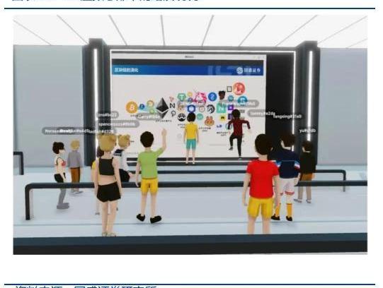 當然,這只是過渡時期的形態,也許這種形態要存在很長一段時間,但我們相信Web3.0新的應用、新的產品邏輯和新的流量范式正在發生。從2D到3D?近期隨著百度希壤、網易伏羲等發布,而三星也在Decentraland上構建虛擬商店,市場逐步關注3D數字世界。而從2D向3D的演進有望成為普通用戶最觸手可及的變化。以國盛區塊鏈研究院在Decentraland中的虛擬總部為例,虛擬建筑本身相當于團隊首頁,可以展示研究產品和團隊情況,當然也可以通過虛擬人進行交互。當需要路演時可在二樓路演大廳演示PPT或接入流媒體,觀眾可通過發放徽章NFT進行白名單管理。我們判斷,在IT基礎設施逐漸完備的基礎上,2022年將有更多社交屬性的流量將升級到3D。