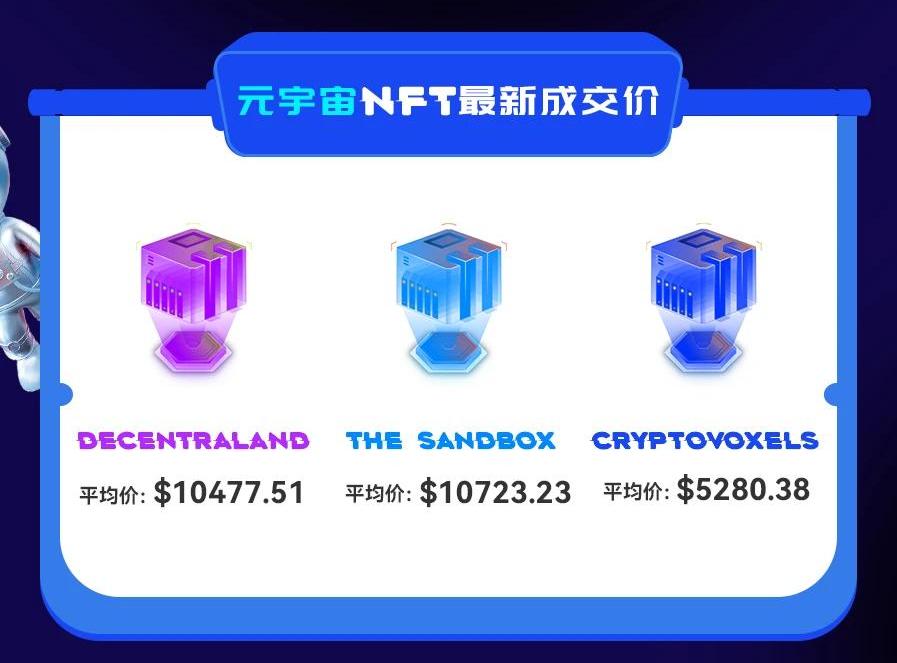 元宇宙平臺中,過去24小時內,Decentraland上的NFT平均成交價為10477.51美元;TheSandbox上的NFT平均成交價為10723.23美元;Cryptovoxels上的NFT平均成交價為5280.38美元。