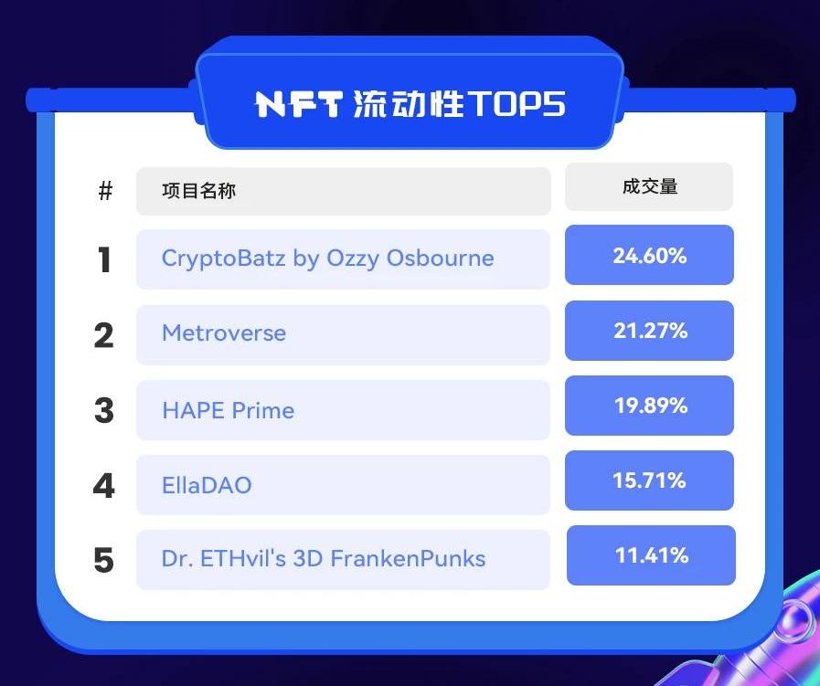按過去24小時流動性指標,排名前五的項目分別為CryptoBatzbyOzzyOsbourne、Metroverse、HAPEPrime、EllaDAO和Dr.ETHvil's3DFrankenPunks。