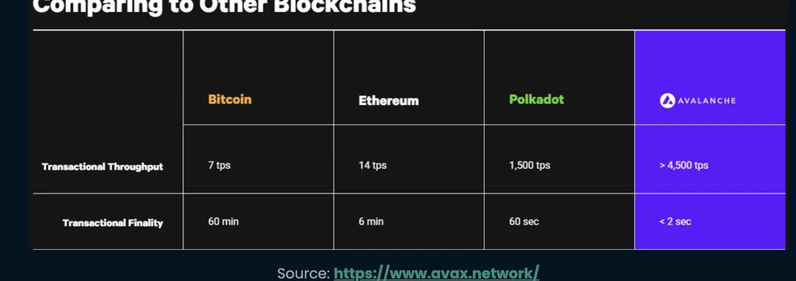 Avalanche交易產量超過4,500tps,交易最終性不到2秒。與其他區塊鏈網絡相比,這很有發展前景。交易產量和終結性比較