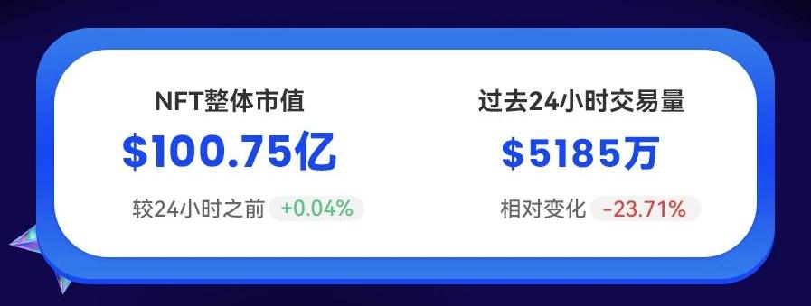 截至12月20日15時,NFT整體市值100.75億美元,較24小時前增長0.04%;過去24小時內總交易量約5185萬美元,日環比下降23.71%。