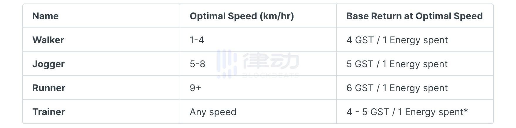 1)Sneaker與ShoeboxSneaker「運動鞋」與Shoebox「鞋盒」均是STEPN中的NFT資產,玩家可穿著Sneaker在戶外步行、慢跑或跑步來賺取獎勵。通過Shoebox,則可以開出4種不同類型的Sneaker,分別為Walker、Jogger、Runner和Trainer。而當玩家穿著不同類型的運動鞋,在相應的最佳配速下運動時,會通過消耗能量來賺取GSTToken。
