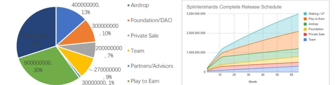 資料來源:GodsUnchainedSplinterlands采用三種ERC-20,SPS作為治理token捕獲項目價值,DEC作為燃料token用于支付與獎勵,Credits是不可轉讓的系統穩定幣,用于購買資產。SPS是發行在BSC上的ERC-20token,總發行量為30億枚,token分配情況:-空投13.33%,根據Airpoints權重進行空投,共空投一年,即每天有1100000SPS用于空投;-Foundation/DAO10%,分65個月發行,由DAO來決定資金用途-私募6.67%,鎖倉10個月-團隊9%,鎖倉65個月-合作伙伴/顧問1%,鎖倉期24個月-PlaytoEarn30%,分65個月發行-Staking/LP/Oracle激勵30%,分65個月發行